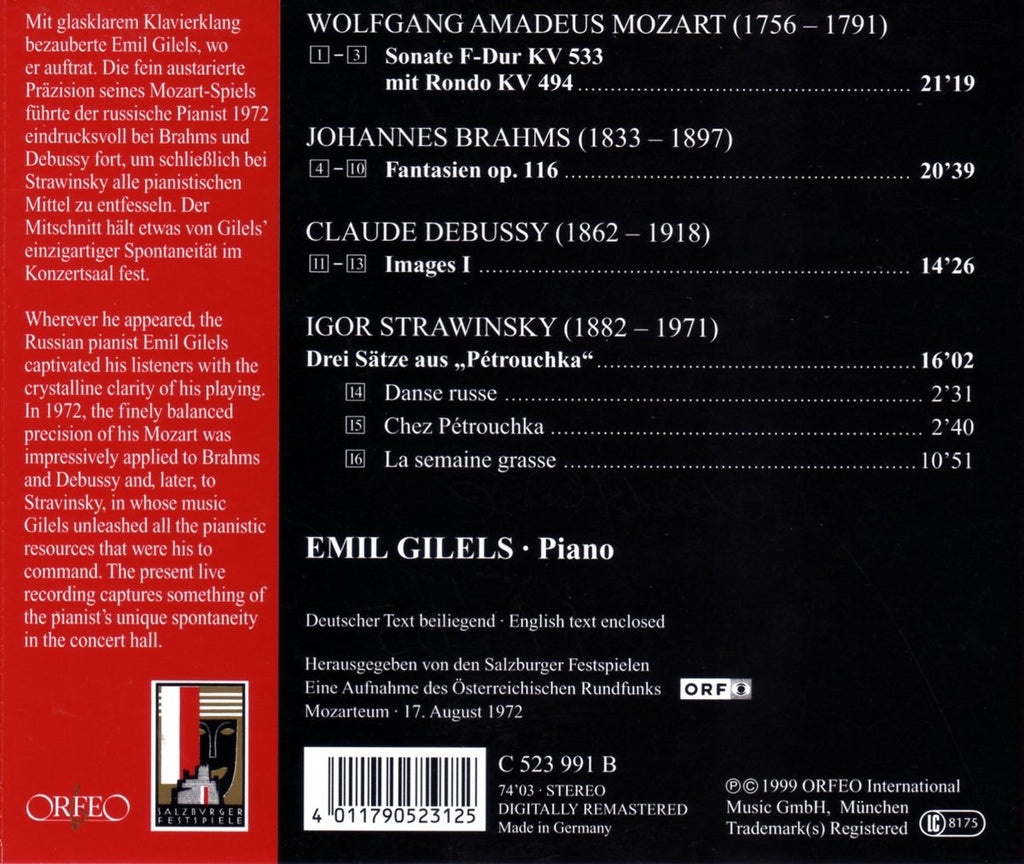 Emil Gilels -Mozart: Sonats KV 533, KV 494 Brahms: Fantasien. Debussy: Images I